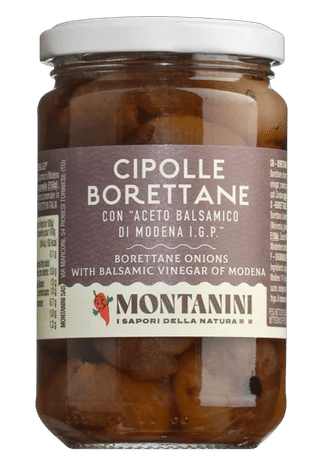 Borettane Zwiebeln , Balsamicoessig 11% , Traubenmost , Weinessig , Farbstoff: E150d , Antioxidationsmittel: E220 , Wasser , Weinessig , Zucker , Salz , Sonnenblumenöl , Olivenöl , Antioxidationsmittel: E220 , enthält Sulfite