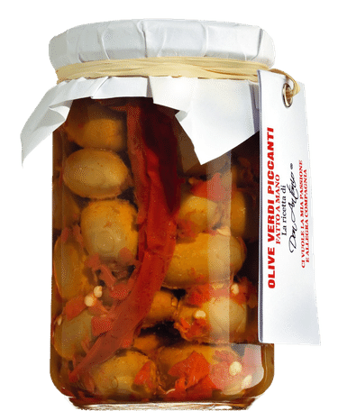 Angedrückte grüne Oliven mit Stein, pikant eingelegt von saftiger, fleischiger Konsistenz. Ein gelungenes Antipasto von Don Antonio aus den Abruzzen, sehr lecker zu Thunfisch oder reifem Pecorino. Gerade geschmacksintensive Pastasaucen profitieren von diesen würzigen Oliven, beispielsweise eine aglio, olio e peperoncino. Man kann sie mit gebratenem Meeresfisch und Schalentieren kombinieren. Sie schmecken im pikanten Eintopf oder als Füllung eines Geflügels und Beilage zu Lamm.