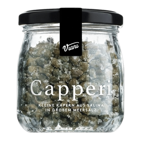 Von der Insel Salina kommen die kleinen Kapern. Sie sind in Meersalz konserviert und müssen gründlich gewässert werden. Dann besitzen sie einen intensiven, eleganten Geschmack. Sie eignen sich als Zutat für Thunfisch- und Gemüsesalate, Vitello tonnato, für Dips und vieles mehr.