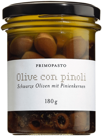 Eine feine Olivenvariante sind diese Leccino-Oliven mit Pinienkernen. Sie schmecken sehr gut zum Aperitif oder Cocktail, aber auch als Beilage zu Geflügel und gebratenem Fisch. Der kurze knackige Biss auf den Pinienkern ist ausgesprochen amüsant.