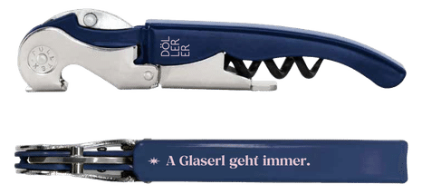 Korkenzieher dunkelblau navy „A Glaserl geht immer“, Schrift rosa