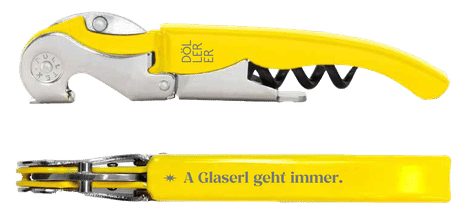 Korkenzieher gelb “A Glaserl geht immer“, Schrift grau
