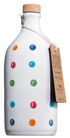 Apulien grüßt farbenfroh. Die handgetöpferten und bemalten Olivenölflaschen sind angelehnt an die jahrhundertealte Terracotta-Tradition der Region. Jedes Jahr erneut füllt Familie Muraglia, seit über 80 Jahren Olivenbauern, besonders gutes Olivenöl nativ extra in die leuchtenden, dekorativen Flaschen. Das reinsortige Öl aus der Peranzana-Olive besitzt eine elegante Feinfruchtigkeit. Die Oliven werden kurz nach der Ernte zwischen Granitsteinen gemahlen und im geschlossenen Extraktionsverfahren gepresst. Das goldene Öl mit den grünen Reflexen besitzt Aromen von Tomaten, Rucola und Artischocken. Es schmeckt frisch und eigenständig und eignet sich hervorragend für Salate, Meeresfrüchte, gegrillten Fisch und Fleisch.