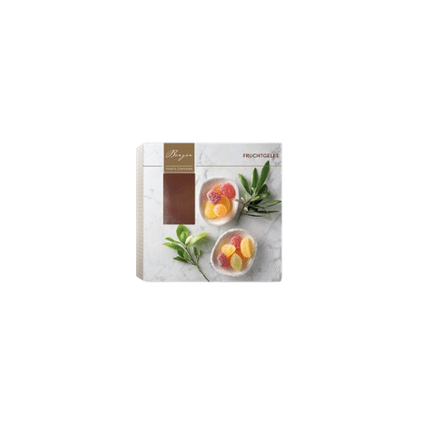 Verschiedene feine Fruchtgelees: Mandarine, Zitrone, Orange, Erdbeere, Himbeere, gelbe und grüne Birne.