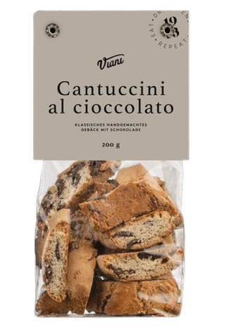 Die beliebten toskanischen Biscotti, knusprig und aromatisch, sind mit zartbitteren Schokoladenstückchen gespickt. Abgesehen von Cappuccino schmeckt auch ein leichter Rotwein dazu.