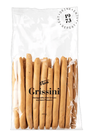 Von Hand gerollte Klassiker für jede Trattoria, die etwas auf sich hält. Mit Olivenöl gebacken. Idealer Snack mit Schinken, zum Wein oder Knabbern. Tipp: Diese extra knusprigen Grissini mit frisch geschnittenen, hauchdünnen Scheiben vom Parmaschinken umwickelt ergeben eine perfekte Vorspeise. Länge circa 25 cm.