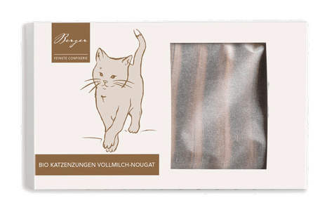 Katzenzungen aus Bio-Vollmilchschokolade mit einer feinen Bio-Nougatfülle. Kakao: 37 % mindestens in der Vollmilchschokolade.