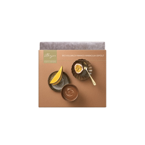 Eine exotische Verführung: Eine fruchtig-frische Ganache aus Mango und Maracuja, ummantelt von zarter Bio-Vollmilchschokolade mit 37 % Kakaoanteil.