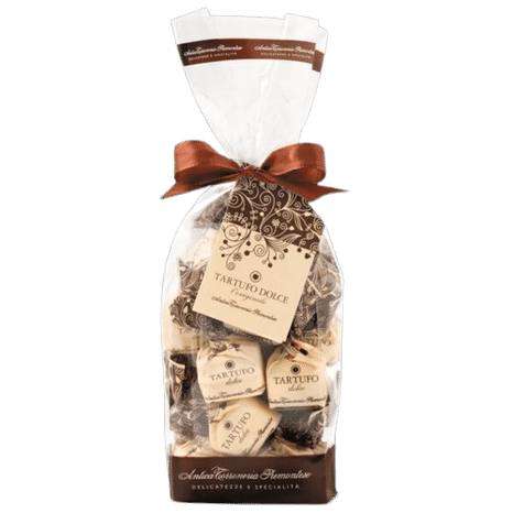 Tartufi dolci aus dunkler Schokolade mit Haselnusstückchen sind fein verpackt im durchsichtigen Geschenkbeutel mit Schleife. Glutenfrei.