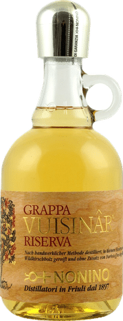Grappa ist der älteste und traditionsreichste Branntwein Norditaliens. Dieser wird aus der Destillation der festen Bestandteile der Trauben, der Trester, gewonnen. Der Grappaproduzent Nonino aus Friaul wählte aus roten und weißen Trestern, welche aus den Anbaugebieten Grave und Colli del Fruili stammen. Die Fermentation erfolgte unter Luftabschluss, in Edelstahlbottichen, bei kontrollierter Temperatur. Unmittelbar danach wird destilliert, um das Entstehen von schädlicher sekundärer Fermentation zu verhindern. Beim Genuss dieses Grappas Vuisinar Riserva, erwartet Sie leicht bensteinfarbenes Destillat, wegen der Reife im Holz. Elegant, mild weich und fein, delikat. Diesen Grappa aus dem Friaul trinkt man am besten Schluck für Schluck nach dem Essen oder zu jeder Tageszeit, als Genuss! Die gereiften Sorten eignen sich perfekt zum Abschluss eines Essens, auch zusammen mit Käse, Foie gras, Schokolade, trockenen Kuchen oder Süßspeisen aus Schokolade; ein Genuss zu einer guten Zigarre oder gemeinsam mit Freunden. Vor dem Verkosten sollte das Destillat einige Minuten im Glas ruhen: durch die Sauerstoffaufnahme kommt der Geruch zur Geltung, die Harmonie Nase-Gaumen wird vollkommener.