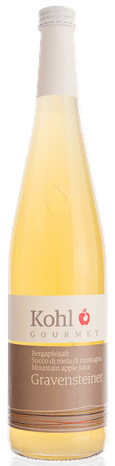 Gepresst wird er von Thomas Kohl (auch bekannt als Obstgut Troidner) aus reifen, handgepflückten Bergäpfeln der seit langem in Südtirol heimischen Sorte Gravensteiner, entstanden im 18. Jahrhundert per Zufall, geblieben über die Jahrhunderte aus Liebe. Mittelgroß bis groß, zur Zeit der Reife gelb mit mittelfestem, sehr saftigem Fruchtfleisch. Das harmonische Verhältnis zwischen Süße und Säure ist die Basis ihres edlen Aromas. Der Bergapfelsaft Gravensteiner von Kohl – Bergapfelsäfte empfiehlt sich vor allem zu Vorspeisen, Meeresfrüchten und Nudelgerichten.