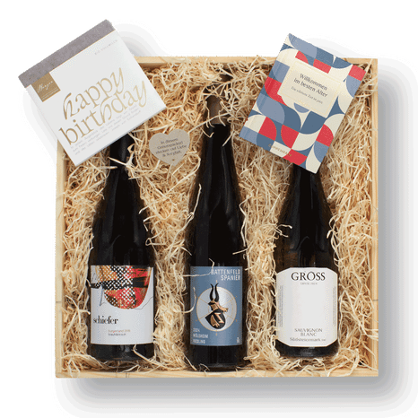 Berger Confiserie, Schokolade "Happy Birthday", 70 gBuch "Willkommen im besten Alter"WG Gross, Sauvignon Blanc DAC, 0,75 lWG Battenfeld-Spanier, Riesling Mölsheim VDP, 0,75 lWG Uwe Schiefer, Blaufränkisch Burgenland, 0,75 l
