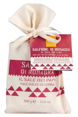 Das mittelkörnige Meersalz wird im Baumwoll-Stoffbeutel aufbewahrt und stammt aus der italienischen Region Emilia Romagna.