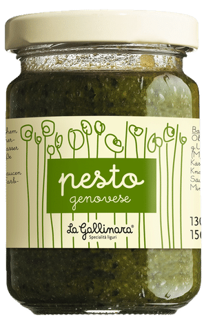 Aufgrund der speziellen klimatischen Verhältnisse und dank der humusreichen Böden wächst an der Riviera di Ponente eine besondere Sorte Basilikums. Nicht kräftig und zitrusartig wie seine Piemonteser Vettern, sondern mit filigranem, nuancenreichem Aroma. Und so ist auch dieses Pesto. Nach Genueser Art mit Olivenöl, Parmesan, Pinienkernen und Knoblauch. Eine äußerst wohlschmeckende Creme, die nicht nur zur Pasta passt, sondern auch zu kaltem Kalbfleisch und Geflügel, auf Mozzarella und in Gemüsesuppen.
