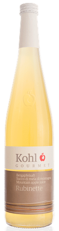 Apfelsäfte vom Berg. Thomas Kohl, der erste Apfelsaft-Affineur Italiens, baut auf beinahe 1.000 m Meereshöhe verschiedene Apfelsorten an & kreiert daraus nach allerhöchsten Qualitätskriterien naturreine Gourmet-Bergapfelsäfte. Er presst Äpfel sortenrein, füllt den Saft in elegante Flaschen & empfiehlt seine Säfte gut gekühlt bei acht bis zwölf Grad im Stielglas zu genießen. Das KOHL Bergapfelsaft Sortiment umfasst sortenreine Bergapfelsäfte, Cuvées aus Bergapfelsaft mit passenden Partnern oder mit Auszügen spannender Aromen & als außergewöhnlicher Höhepunkt: limitierte Grand-Cru-Säfte aus alten Apfelsorten wie Ananasrenette & Wintercalville.