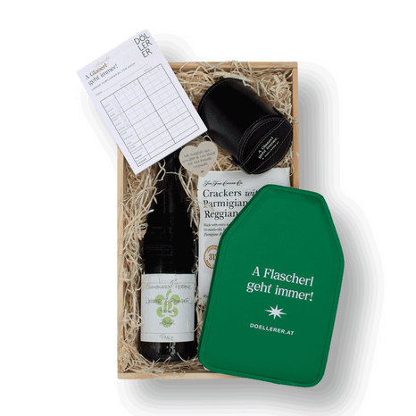 Döllerers Würfelbecher inkl. 5 WürfelDöllerers Spielblock "A Grande geht immer"Döllerers Kühlmanschette "A Flascherl geht immer", grünCheese Company, Crackers mit Parmesan, 45 g